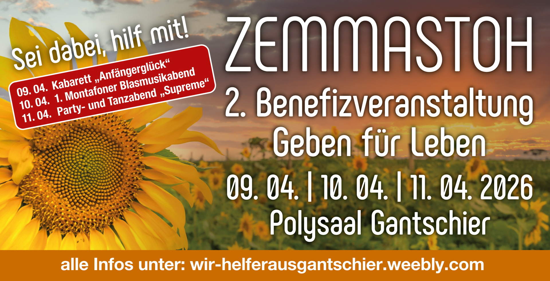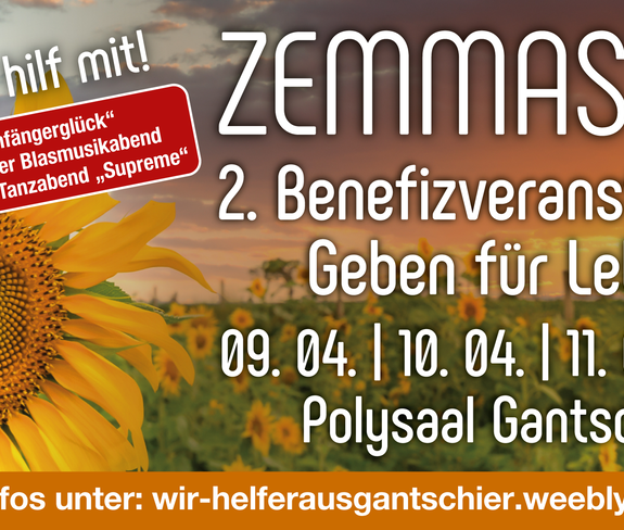Die Benefizveranstaltung "Zemmastoh" im Polysaal Gantschier unterstützt in diesem Jahr Geben für Leben Leukämiehilfe. An drei Abenden erwartet Dich ein abwechslungsreiches Programm: Am Donnerstag tritt das Kabarett "Anfängerglück" auf, gefolgt vom 1. Montafoner Blasmusikabend am Freitag. Den Abschluss bildet am Samstag ein Auftritt von der bekannten Vorarlberger Tanz und Party Band "Supreme".