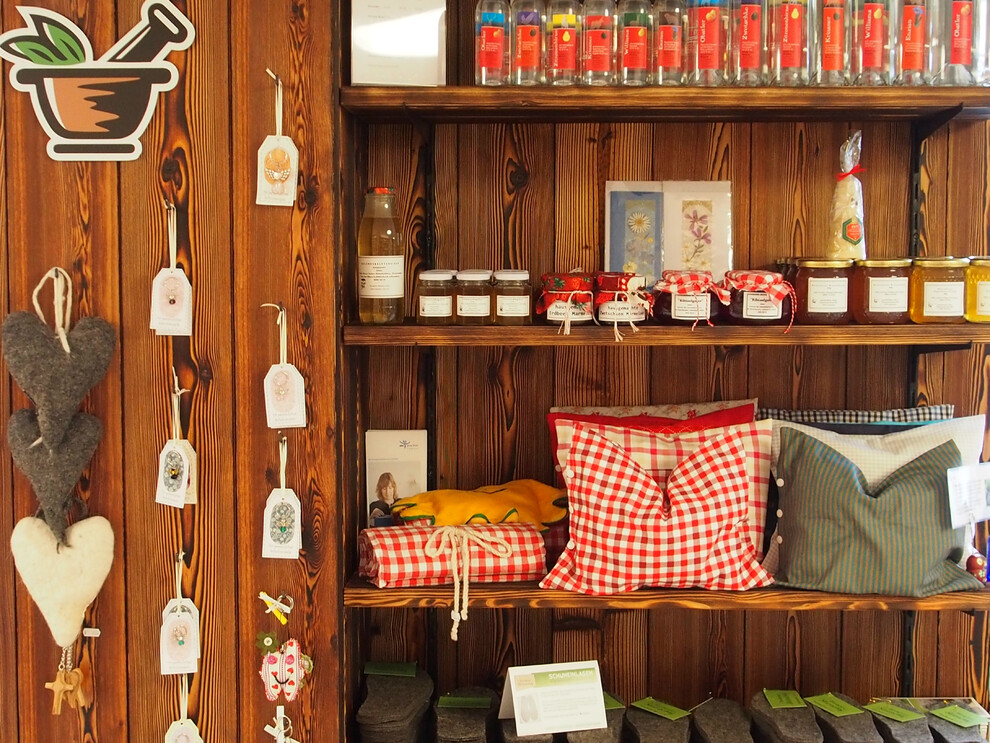Eigenprodukte wie: Hausgemachte Geschmack-und Gesundheitstees, Ringelblumensalbe, Pechsalbe, Lippenpflege, Johannisblütenöl, Schwedenbitter, Hustensaft, Hautpflegeöle und verschiedene Tinkturen