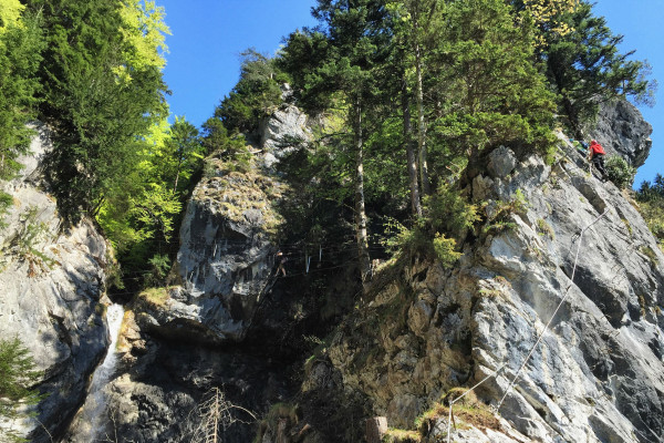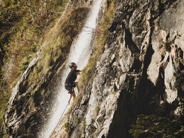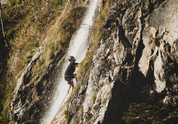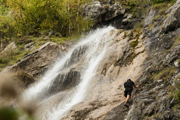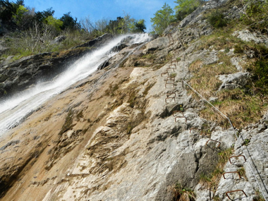 Klettern entlang des Wasserfalls oberhalb von St. Anton im Montafon