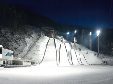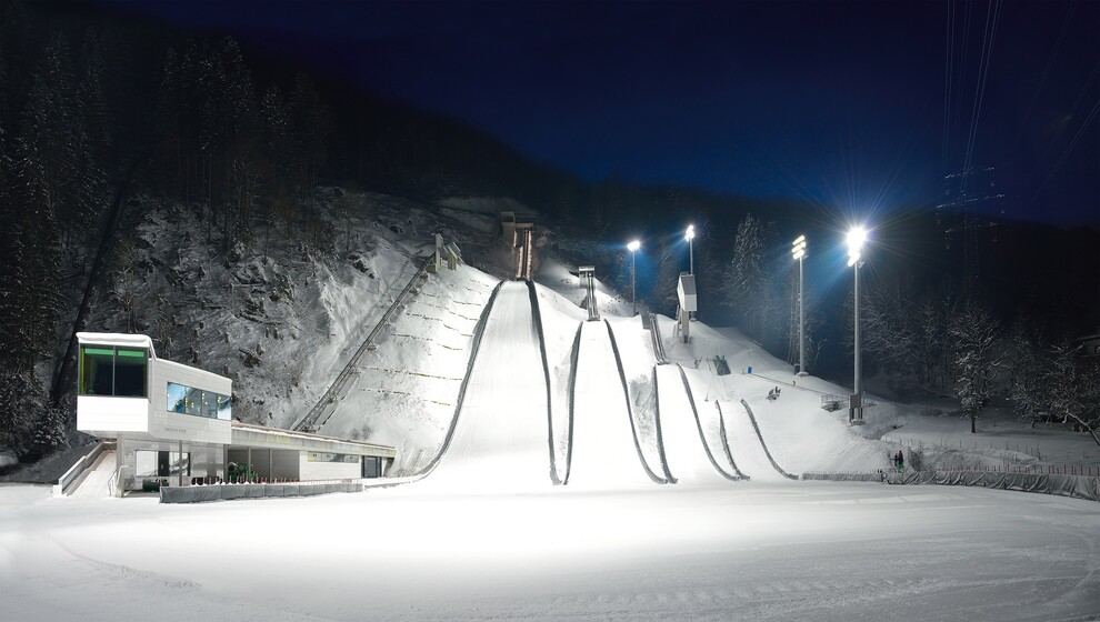 Zusätzlich ist die Anlage mit Flutlicht ausgestattet und ermöglicht so auch bei schlechter Wetterlage bzw. im Winter einen ganztägigen Trainingsbetrieb. Der Transport der Athlet*innen auf die Schanzen erfolgt mittels einer selbst fahrenden Kabinenbahn für 18 Personen, sowie mit Hilfe eines Förderbandes für die kleinste Schanze HS22.