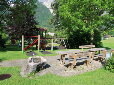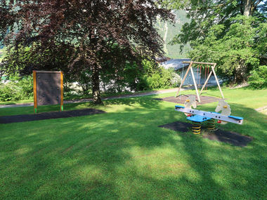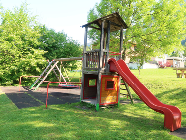 Öffentlicher Spielplatz mit Sitzgelegenheiten und Trinkbrunnen in der Nähe des Gemeindezentrums (oberhalb vom Sportplatz).